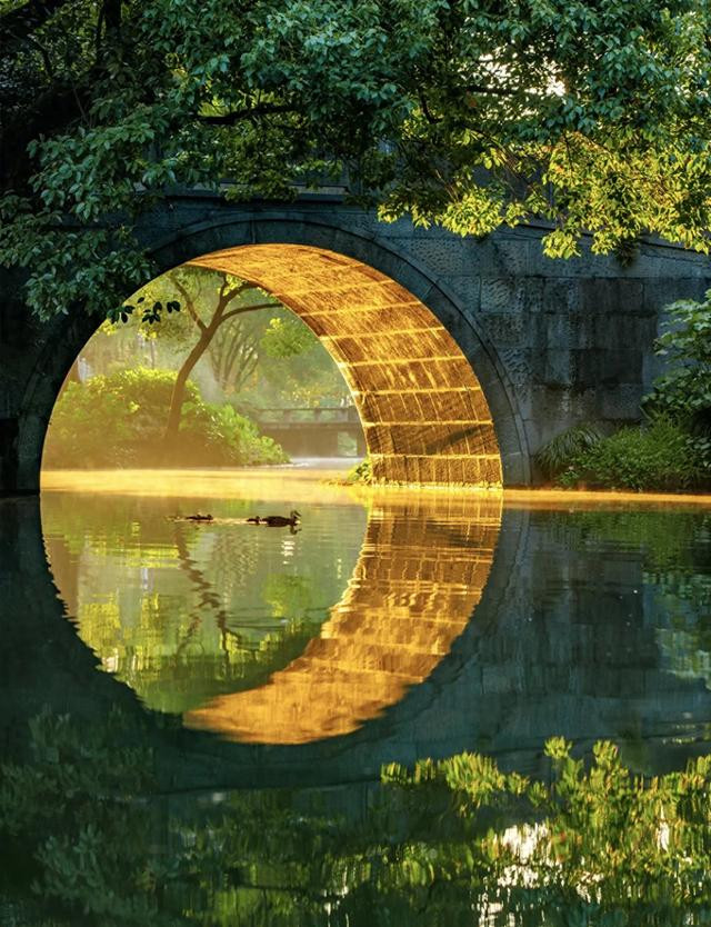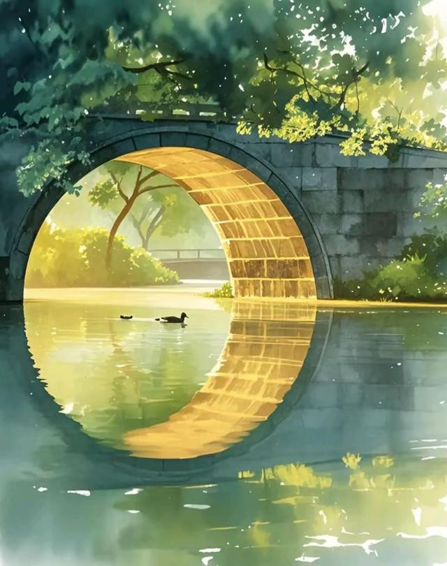 这是一幅充满诗意的影相作品,画面中一座古朴的石拱桥横跨在宁静的水面上。阳光透过宽广的树梢,洒在桥拱和水面上,酿成了一幅瑰丽的光影遵循。桥拱的倒影在水中明晰可见,仿佛与桥自己酿成一个完好意思的圆,增添了画面的对称好意思。水面上有几只鸭子怡然地游动,为这幅静谧的画面增添了几分活泼与活力。