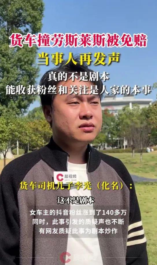 事发后,劳斯莱斯车主和货车司机竣事息争,并录视频发布在酬酢媒体平台,但指摘区也有不少网友认为这次车祸是“脚本”,有摆拍嫌疑。据了解,因为这次车祸,劳斯莱斯女车主的酬酢账号粉丝数飞涨,领域2024年11月10日22:30,账号粉丝依然蹂躏140万,获赞超440万,货车司机老李的粉丝也蹂躏了2万。