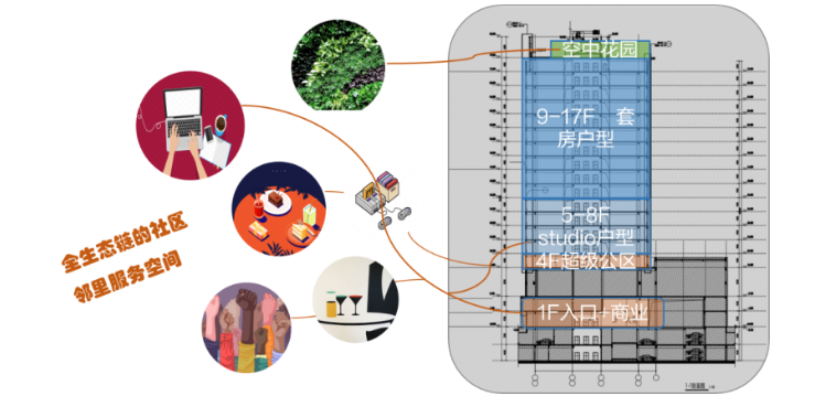 将“生意+住客+社区”有机连系,打造一个唯独无二的“垂直村庄”,找回城市里逐渐荒废的邻里探讨和熟东说念主外交。