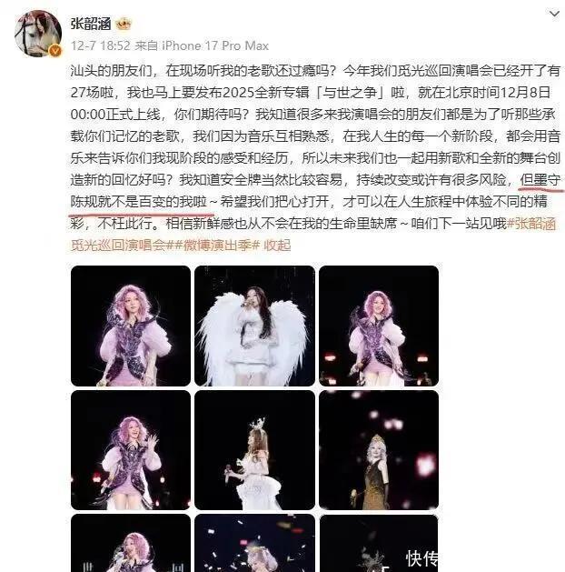 我们望望张韶涵这辈子的本性。2012年我方开发公司,图的是什么?不即是为了不听那些大唱片公司的品头题足吗?她即是一个念念我方说了算的东谈主。是以当她发文说“念念掀开新体验崭新感”时,我看到的是一个中年艺东谈主终末的倔强。