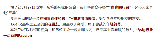 距离3月37日《率土之滨》芳华服公测上线仍是不及3天九游体育app娱乐,官方终于是把憋着很久的大招给放出来了一些,在公众号上搞出了一张私密兮兮的代言东谈主海报,还配上了一句很霸气的代言标语——要给SLG小数Passion(豪情)!