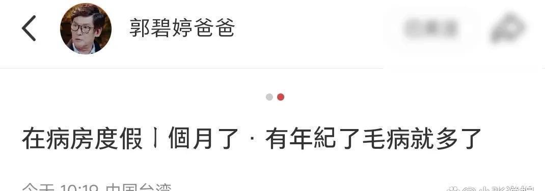 郭碧婷嫁入向家后,一直过着令东谈主称羡的幸福生计,不仅家庭温煦,还儿女双全,备受世东谈主钦慕。而在婆家这边,其乐融融的画面弥远如常,然则娘家却显得不太安详。日前,郭碧婷80岁的老父亲在台北入院,并晒出了像片。像片中,郭爸爸戴着口罩,面容憔悴,理会出岁月的沧桑,脸上的胡子与头发真的全白,皆备不见早年参与综艺节目时的色调奕奕。