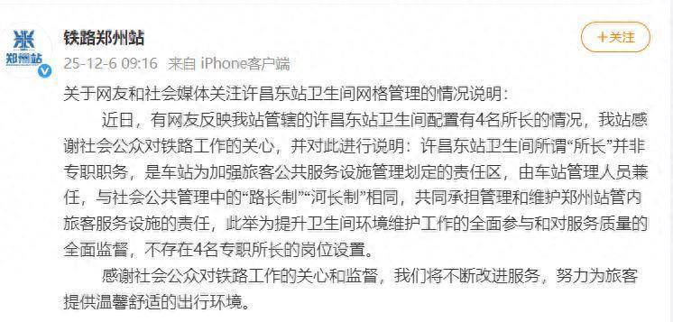 近日,有网友反应我站统率的许昌东站卫生间建立有4名长处的情况,我站感谢社会公众对铁路职责的情态,并对此进行讲解:许昌东站卫生间所谓“长处”并非专职职务,是车站为加强搭客大家职业智商解决规定的背负区,由车站解决东谈主员兼任,与社会大家解决中的“路长制”“河长制”雷同,共同承担解决和珍贵郑州站管内搭客职业智商的背负,此举为进步卫生间环境珍贵职责的全面参与和对职业质地的全面监督,不存在4名专职长处的岗亭修复。感谢社会公众对铁路职责的情态和监督,咱们将不休修订职业,致力为搭客提供温馨满足的出行环境。
