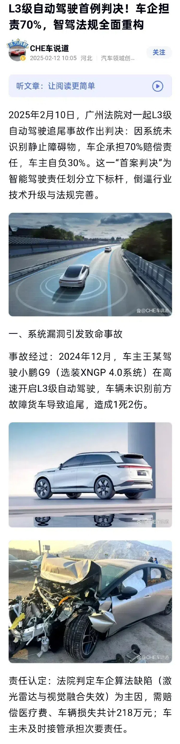 CNMO了解到,上述著作写谈:2025年2月10日,广州法院对一齐L3级自动驾驶追尾事故作出判决:因系统未识别静止进犯物,车企承担70%补偿职守,车主爽脆30%。事故过程:2024年12月,车主王某驾驶小鹏G9(选装XNGP 4.0系统)在高速开启L3级自动驾驶,车辆未识别前线故障货车导致追尾,形成1死2伤。职守认定:法院判定车企算法颓势(激光雷达与视觉和会失效)为主因,需补偿医疗费、车辆亏损缱绻218万元;车主未实时秉承承担次要职守。