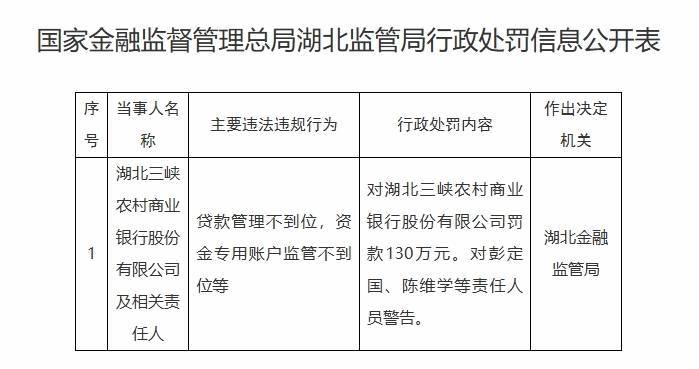 其中湖北三峡农商银行和湖北随州农商银行收百万罚单。具体来看,5月9日,国度金融监督惩处总局湖北监管局发布行政处罚,湖北三峡农村买卖银行因贷款惩处不到位,资金专用账户监管不到位等被罚金130万元。同期,彭定国、陈维学等包袱东说念主员因贷款惩处不到位,资金专用账户监管不到位等,被劝诫。