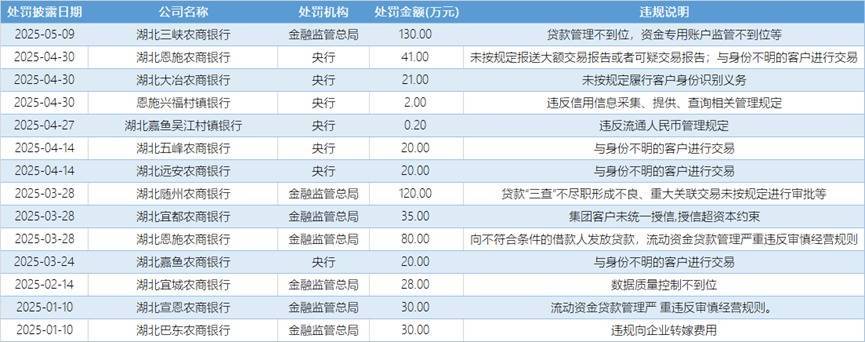日前,据同花顺iFinD数据清晰,2025年以来,湖北农信系统共有14家银行收罚单九游体育app官网,总共被罚金额577.2万元,包括12家农商行和2家村镇银行。触及的作恶违法事实主要有贷款惩处不到位、资金专用账户监管不到位、与身份不解的客户进行交往、贷款“三查”不尽责酿成不良等。