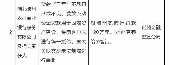 2025年3月,湖北随州农商银行因贷款“三查”不尽责酿成不良、披发流动资金贷款用于固定钞票建造、集团客户未进行调理授信、紧要关系交往未按端正进行审批,被随州金融监管分局罚金120万元。