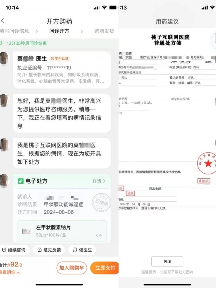 记者在淘宝购买调养处方药左甲状腺素钠已而发现,患者只需在填写问诊信息时写明患有“甲状腺功能减退症”,该平台分拨的问诊医师便会径直开具电子处方,参加付款页面。而在不少线下药房开具处方药时也存在这种情况,店内使命主谈主员提真金不怕火记者身份证号码后,便在线上连线医师,在医师并未与记者换取病情的情况下,便能开出患者想要购买的处方药。
