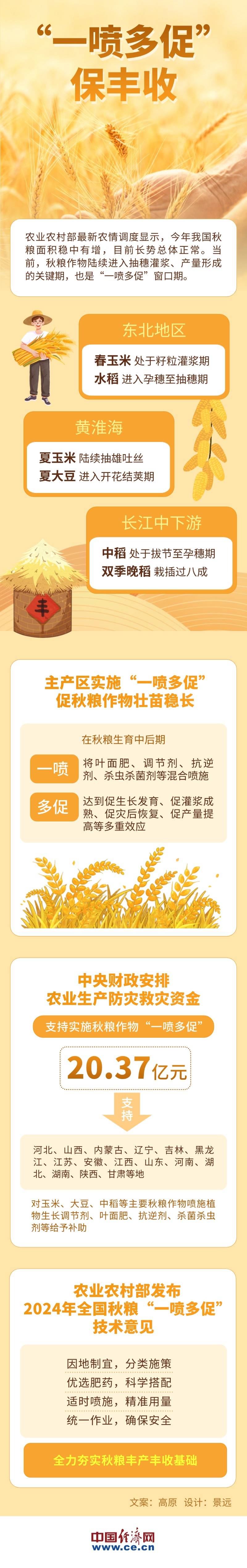 “一喷多促”是指在秋粮生养中后期,将叶面肥、退换剂、抗逆剂、杀虫杀菌剂等混杂喷施,一次功课不错竣事促滋长发育、促灌浆熟悉、促灾后收复、促产量培育档多重效应,是秋粮中后期有灾防灾、无灾增产的关节行径。